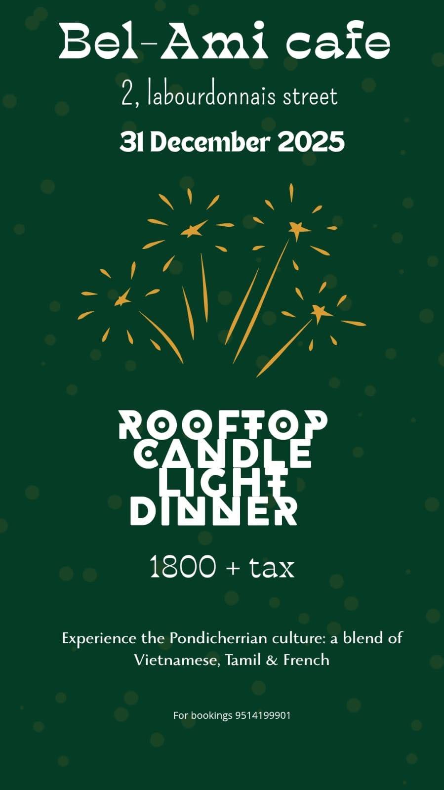 Celebrate New Year’s Eve in an intimate and elegant setting at Bel-Ami Cafe, located in the heart of White Town, Pondicherry. This Rooftop Candle Light Dinner offers a calm, culturally rich alternative to loud parties—perfect for couples and guests seeking a refined New Year experience.