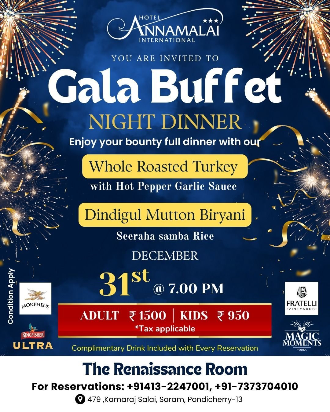 Gala buffet dinner Enjoy your bounty full dinner With our Special Dindigul seerahasamba mutton briyani & Whole rosted Turkey