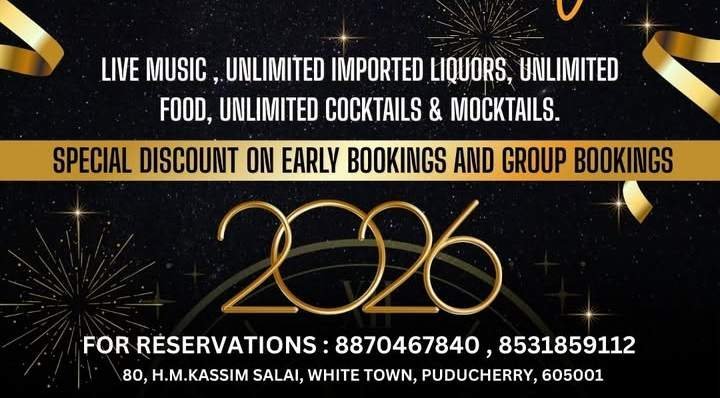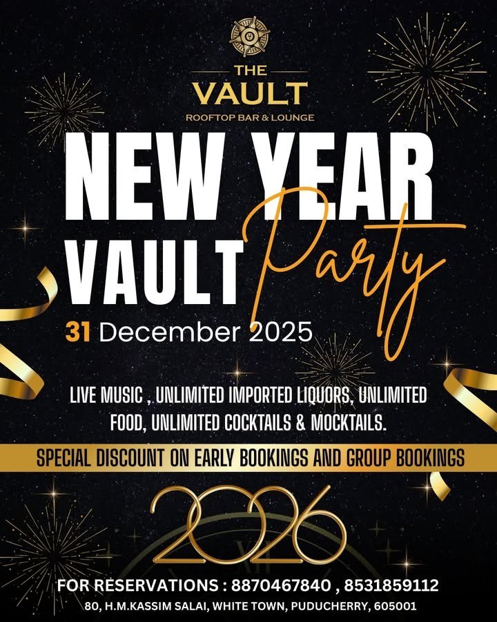 - Venue: The Vault Rooftop Bar & Lounge, 80, H.M. Kassim Salai, White Town, Puducherry 605001 β A stylish rooftop spot in the charming French Quarter, offering panoramic views, elegant ambiance, and a perfect setting for festive nights in Pondicherry’s heritage area.
