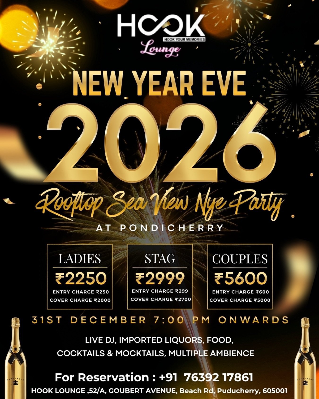 Welcome New Year’s Eve 2026 in style at Hook Lounge, Pondicherry, with an unforgettable rooftop sea-view celebration. As the city lights shimmer and fireworks light up the sky, enjoy a high-energy DJ night paired with premium imported liquors, handcrafted cocktails, and delicious food.