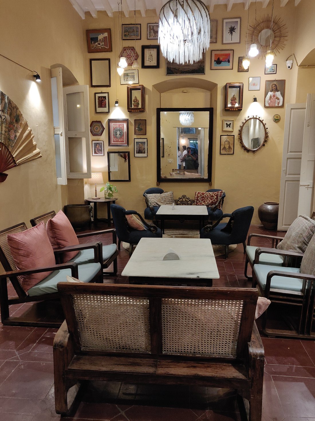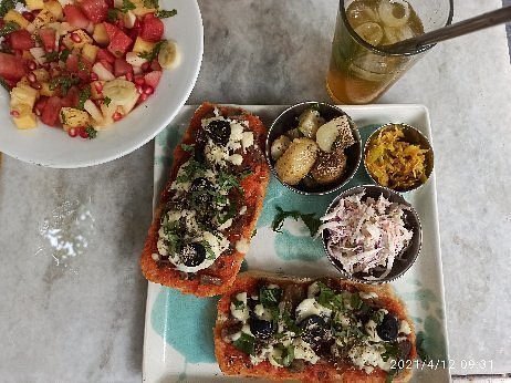 The cafe is situated in Pondi white town. The colorful entrance to the cafe, big lawn/garden sitting area, beautiful architecture inside takes you back in time.