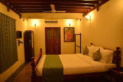 All rooms are equipped with wardrobes, dressing tables, writing tables, and coat hangers, all from an era bygone, curated by experts, blending well with the modern amenities of air conditioners, Wi-Fi, LED televisions, with DTH connection and solar water heaters. The hotel rooms and lobbies are adorned with paintings, murals, art facets, ornaments, and vessels, perfectly capturing the memories reminding guests of the lifestyles of the people who dwelled in those times. The suite rooms have a beautiful four-post bed and a beautiful long balcony with tiled overhangs that reminds of a time past. The balcony overlooks the long narrow street that leads out to the main road.