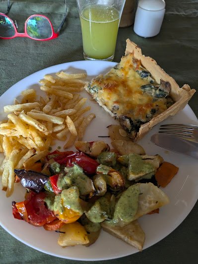 Offers French‑influenced continental fare: quiches, crepes, gratins, ratatouille pasta, salads, roast chicken, mushroom tart, and desserts like fruit cake and lemon.