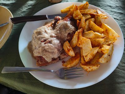 Roast/garlic chicken, fruit cake, lemon pie. Herbal tea using in-house herbs and fresh juices.